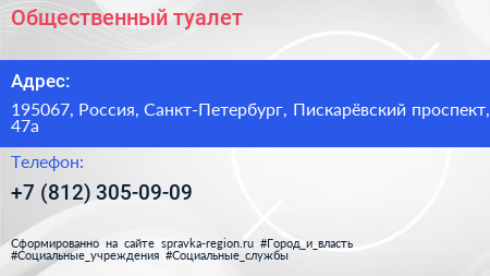 Общественный туалет по адресу 195067, Россия, Санкт-Петербург, Пискарёвский проспект, 47а в дальнейшем Организация, размещена в следующих категориях: