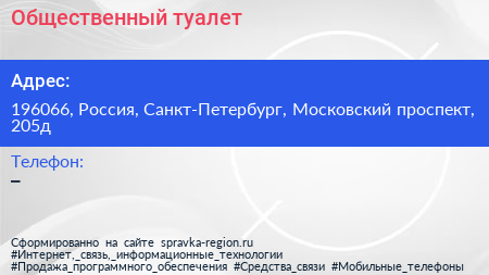 Общественный туалет по адресу 196066, Россия, Санкт-Петербург, Московский проспект, 205д в дальнейшем Организация, размещена в следующих категориях: