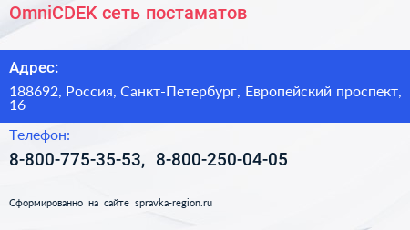 OmniCDEK, сеть постаматов по адресу 188692, Россия, Санкт-Петербург, Европейский проспект, 16 в дальнейшем Организация, размещена в следующих категориях: