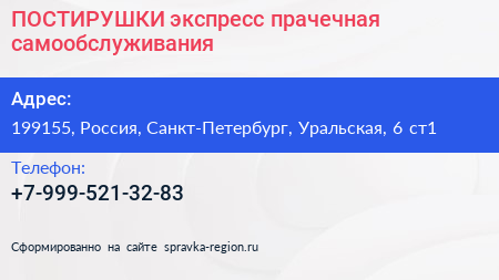 ПОСТИРУШКИ, экспресс-прачечная самообслуживания по адресу 199155, Россия, Санкт-Петербург, Уральская, 6 ст1 в дальнейшем Организация, размещена в следующих категориях: