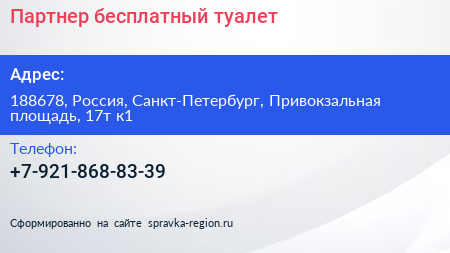 Партнер, бесплатный туалет по адресу 188678, Россия, Санкт-Петербург, Привокзальная площадь, 17т к1 в дальнейшем Организация, размещена в следующих категориях: