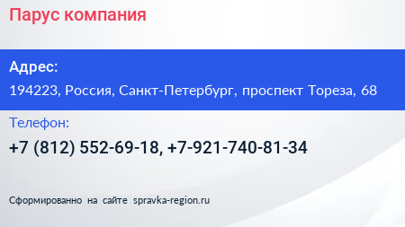 Парус, компания по адресу 194223, Россия, Санкт-Петербург, проспект Тореза, 68 в дальнейшем Организация, размещена в следующих категориях: