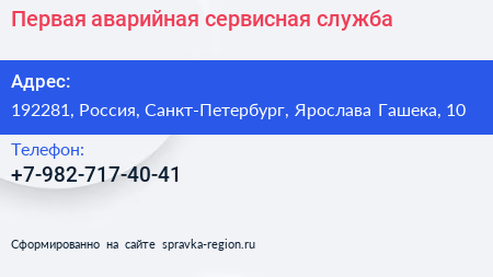 Первая аварийная сервисная служба по адресу 192281, Россия, Санкт-Петербург, Ярослава Гашека, 10 в дальнейшем Организация, размещена в следующих категориях: