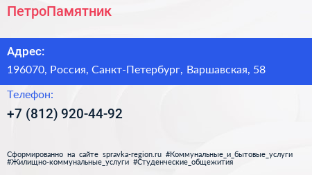 ПетроПамятник по адресу 196070, Россия, Санкт-Петербург, Варшавская, 58 в дальнейшем Организация, размещена в следующих категориях: