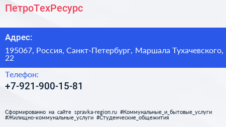 ПетроТехРесурс по адресу 195067, Россия, Санкт-Петербург, Маршала Тухачевского, 22 в дальнейшем Организация, размещена в следующих категориях: