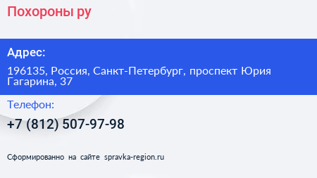 Похороны.ру по адресу 196135, Россия, Санкт-Петербург, проспект Юрия Гагарина, 37 в дальнейшем Организация, размещена в следующих категориях: