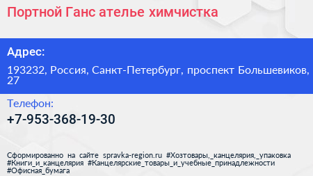 Портной Ганс, ателье-химчистка по адресу 193232, Россия, Санкт-Петербург, проспект Большевиков, 27 в дальнейшем Организация, размещена в следующих категориях: