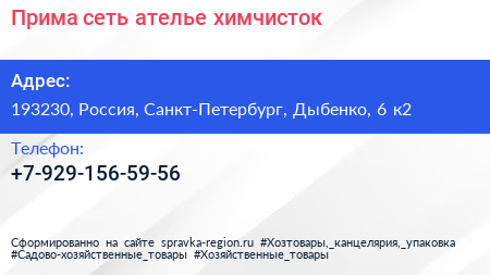 Прима, сеть ателье-химчисток по адресу 193230, Россия, Санкт-Петербург, Дыбенко, 6 к2 в дальнейшем Организация, размещена в следующих категориях: