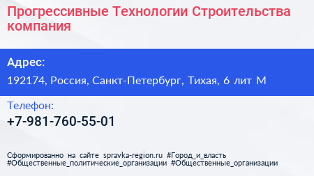 Прогрессивные Технологии Строительства, компания по адресу 192174, Россия, Санкт-Петербург, Тихая, 6 лит М в дальнейшем Организация, размещена в следующих категориях:
