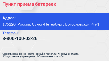 Пункт приема батареек по адресу 195220, Россия, Санкт-Петербург, Богословская, 4 к1 в дальнейшем Организация, размещена в следующих категориях: