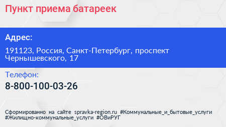 Пункт приема батареек по адресу 191123, Россия, Санкт-Петербург, проспект Чернышевского, 17 в дальнейшем Организация, размещена в следующих категориях: