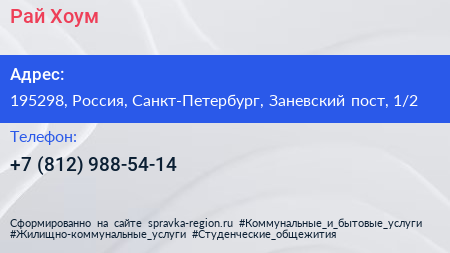 Рай Хоум по адресу 195298, Россия, Санкт-Петербург, Заневский пост, 1/2 в дальнейшем Организация, размещена в следующих категориях: