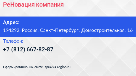 РеНовация, компания по адресу 194292, Россия, Санкт-Петербург, Домостроительная, 16 в дальнейшем Организация, размещена в следующих категориях:
