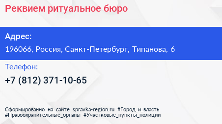 Реквием, ритуальное бюро по адресу 196066, Россия, Санкт-Петербург, Типанова, 6 в дальнейшем Организация, размещена в следующих категориях: