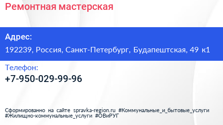 Ремонтная мастерская по адресу 192239, Россия, Санкт-Петербург, Будапештская, 49 к1 в дальнейшем Организация, размещена в следующих категориях:
