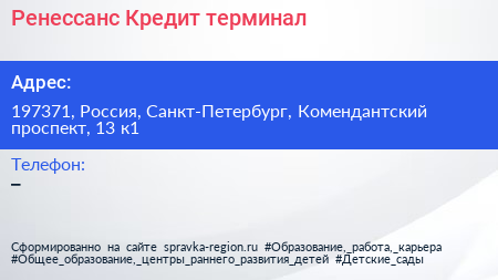 Ренессанс Кредит, терминал по адресу 197371, Россия, Санкт-Петербург, Комендантский проспект, 13 к1 в дальнейшем Организация, размещена в следующих категориях: