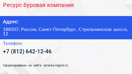 Ресурс, буровая компания по адресу 188507, Россия, Санкт-Петербург, Стрельнинское шоссе, 12 в дальнейшем Организация, размещена в следующих категориях: