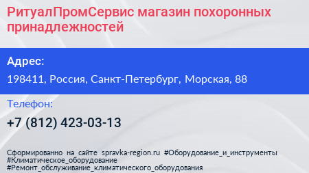 РитуалПромСервис, магазин похоронных принадлежностей по адресу 198411, Россия, Санкт-Петербург, Морская, 88 в дальнейшем Организация, размещена в следующих категориях: