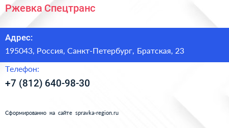 Ржевка Спецтранс по адресу 195043, Россия, Санкт-Петербург, Братская, 23 в дальнейшем Организация, размещена в следующих категориях: