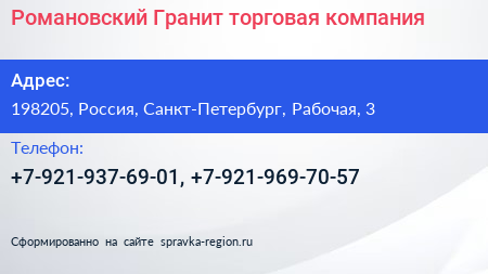 Романовский Гранит, торговая компания по адресу 198205, Россия, Санкт-Петербург, Рабочая, 3 в дальнейшем Организация, размещена в следующих категориях: