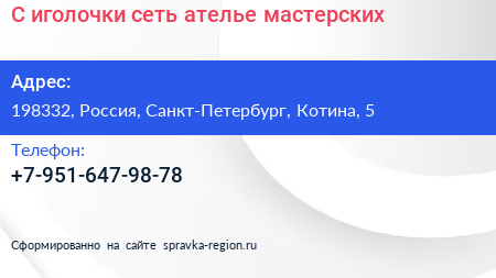 С иголочки, сеть ателье-мастерских по адресу 198332, Россия, Санкт-Петербург, Котина, 5 в дальнейшем Организация, размещена в следующих категориях: