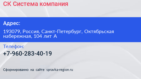 СК Система, компания по адресу 193079, Россия, Санкт-Петербург, Октябрьская набережная, 104 лит А в дальнейшем Организация, размещена в следующих категориях: