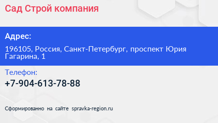 Сад Строй, компания по адресу 196105, Россия, Санкт-Петербург, проспект Юрия Гагарина, 1 в дальнейшем Организация, размещена в следующих категориях:
