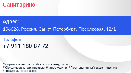 Санитарино по адресу 196626, Россия, Санкт-Петербург, Поселковая, 12/1 в дальнейшем Организация, размещена в следующих категориях:
