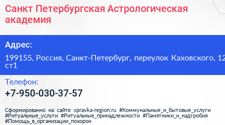 Санкт-Петербургская Астрологическая академия по адресу 199155, Россия, Санкт-Петербург, переулок Каховского, 12 ст1 в дальнейшем Организация, размещена в следующих категориях: