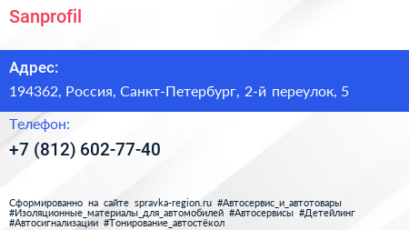 Sanprofil по адресу 194362, Россия, Санкт-Петербург, 2-й переулок, 5 в дальнейшем Организация, размещена в следующих категориях: