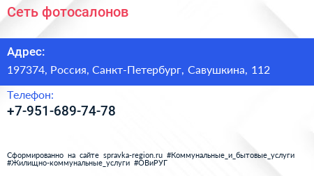 Сеть фотосалонов по адресу 197374, Россия, Санкт-Петербург, Савушкина, 112 в дальнейшем Организация, размещена в следующих категориях: