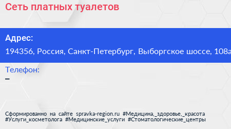 Сеть платных туалетов по адресу 194356, Россия, Санкт-Петербург, Выборгское шоссе, 108а в дальнейшем Организация, размещена в следующих категориях: