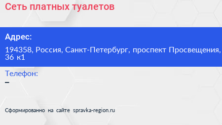Сеть платных туалетов по адресу 194358, Россия, Санкт-Петербург, проспект Просвещения, 36 к1 в дальнейшем Организация, размещена в следующих категориях: