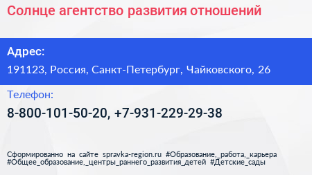 Солнце, агентство развития отношений по адресу 191123, Россия, Санкт-Петербург, Чайковского, 26 в дальнейшем Организация, размещена в следующих категориях: