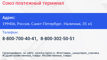 Союз, платежный терминал по адресу 199406, Россия, Санкт-Петербург, Наличная, 35 к1 в дальнейшем Организация, размещена в следующих категориях: