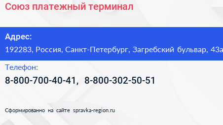 Союз, платежный терминал по адресу 192283, Россия, Санкт-Петербург, Загребский бульвар, 43а в дальнейшем Организация, размещена в следующих категориях: