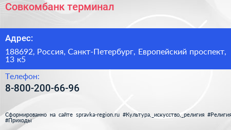 Совкомбанк, терминал по адресу 188692, Россия, Санкт-Петербург, Европейский проспект, 13 к5 в дальнейшем Организация, размещена в следующих категориях: