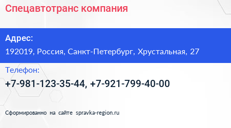 Спецавтотранс, компания по адресу 192019, Россия, Санкт-Петербург, Хрустальная, 27 в дальнейшем Организация, размещена в следующих категориях:
