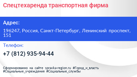 Спецтехаренда, транспортная фирма по адресу 196247, Россия, Санкт-Петербург, Ленинский проспект, 151 в дальнейшем Организация, размещена в следующих категориях: