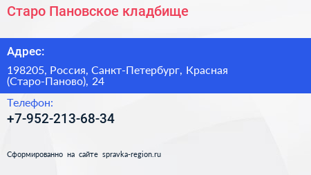 Старо-Пановское кладбище по адресу 198205, Россия, Санкт-Петербург, Красная (Старо-Паново), 24 в дальнейшем Организация, размещена в следующих категориях:
