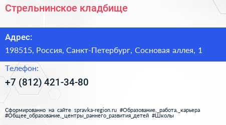 Стрельнинское кладбище по адресу 198515, Россия, Санкт-Петербург, Сосновая аллея, 1 в дальнейшем Организация, размещена в следующих категориях: