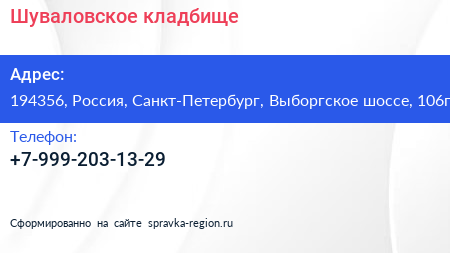 Шуваловское кладбище по адресу 194356, Россия, Санкт-Петербург, Выборгское шоссе, 106г в дальнейшем Организация, размещена в следующих категориях: