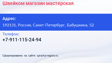 Швейком, магазин-мастерская по адресу 192131, Россия, Санкт-Петербург, Бабушкина, 52 в дальнейшем Организация, размещена в следующих категориях: