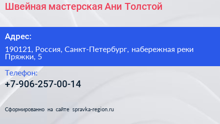 Швейная мастерская Ани Толстой по адресу 190121, Россия, Санкт-Петербург, набережная реки Пряжки, 5 в дальнейшем Организация, размещена в следующих категориях: