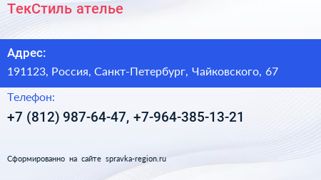 ТекСтиль, ателье по адресу 191123, Россия, Санкт-Петербург, Чайковского, 67 в дальнейшем Организация, размещена в следующих категориях: