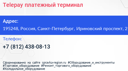 Telepay, платежный терминал по адресу 195248, Россия, Санкт-Петербург, Ириновский проспект, 2 в дальнейшем Организация, размещена в следующих категориях: