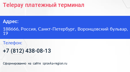 Telepay, платежный терминал по адресу 188666, Россия, Санкт-Петербург, Воронцовский бульвар, 19 в дальнейшем Организация, размещена в следующих категориях:
