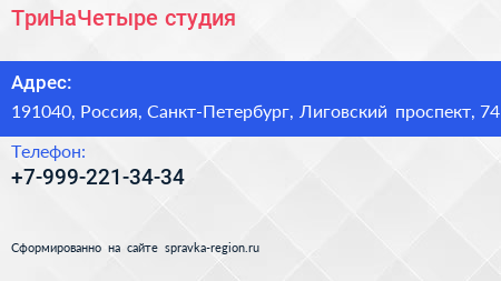 ТриНаЧетыре, студия по адресу 191040, Россия, Санкт-Петербург, Лиговский проспект, 74 в дальнейшем Организация, размещена в следующих категориях: