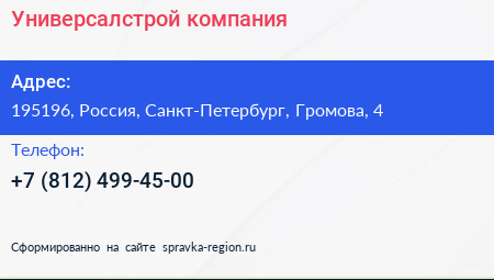 Универсалстрой, компания по адресу 195196, Россия, Санкт-Петербург, Громова, 4 в дальнейшем Организация, размещена в следующих категориях: