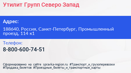 Утилит Групп Северо-Запад по адресу 188640, Россия, Санкт-Петербург, Промышленный проезд, 114 к1 в дальнейшем Организация, размещена в следующих категориях: